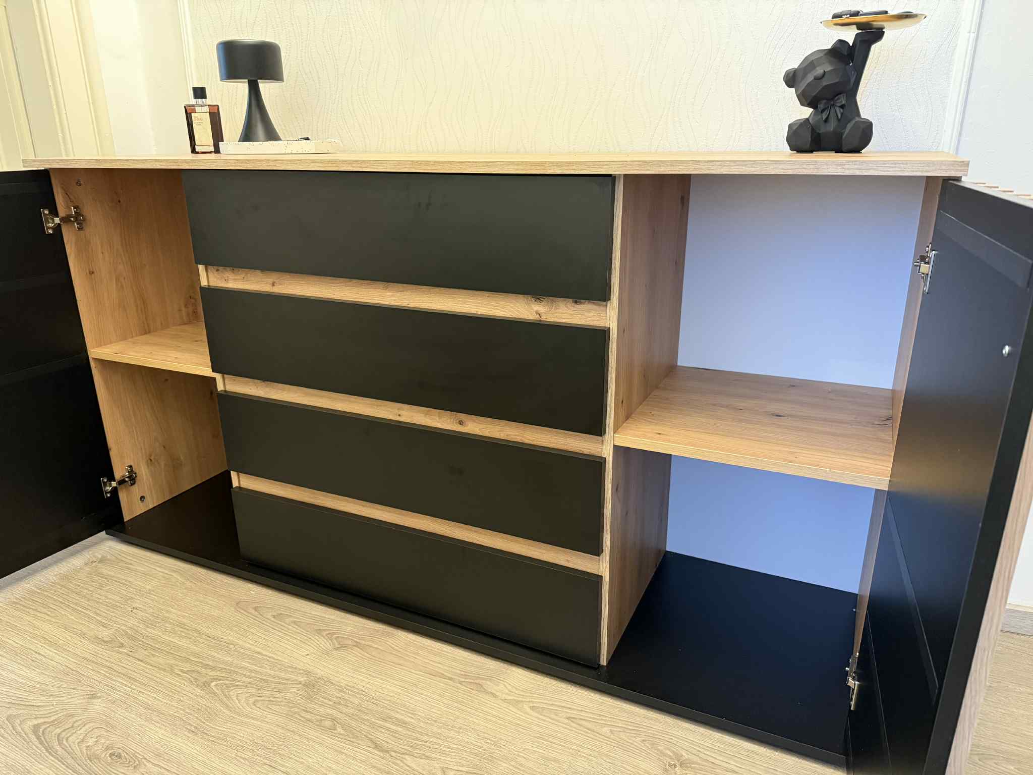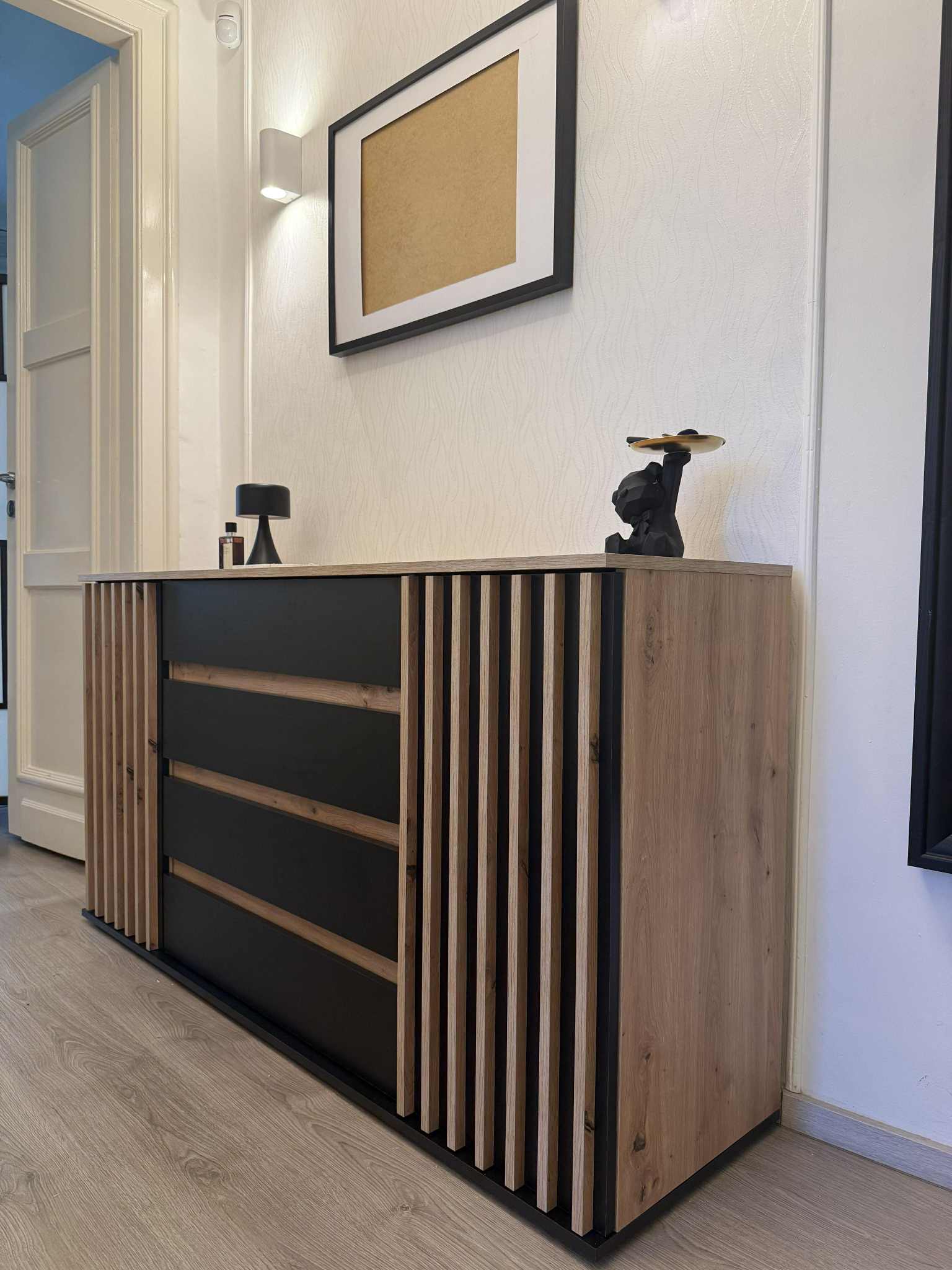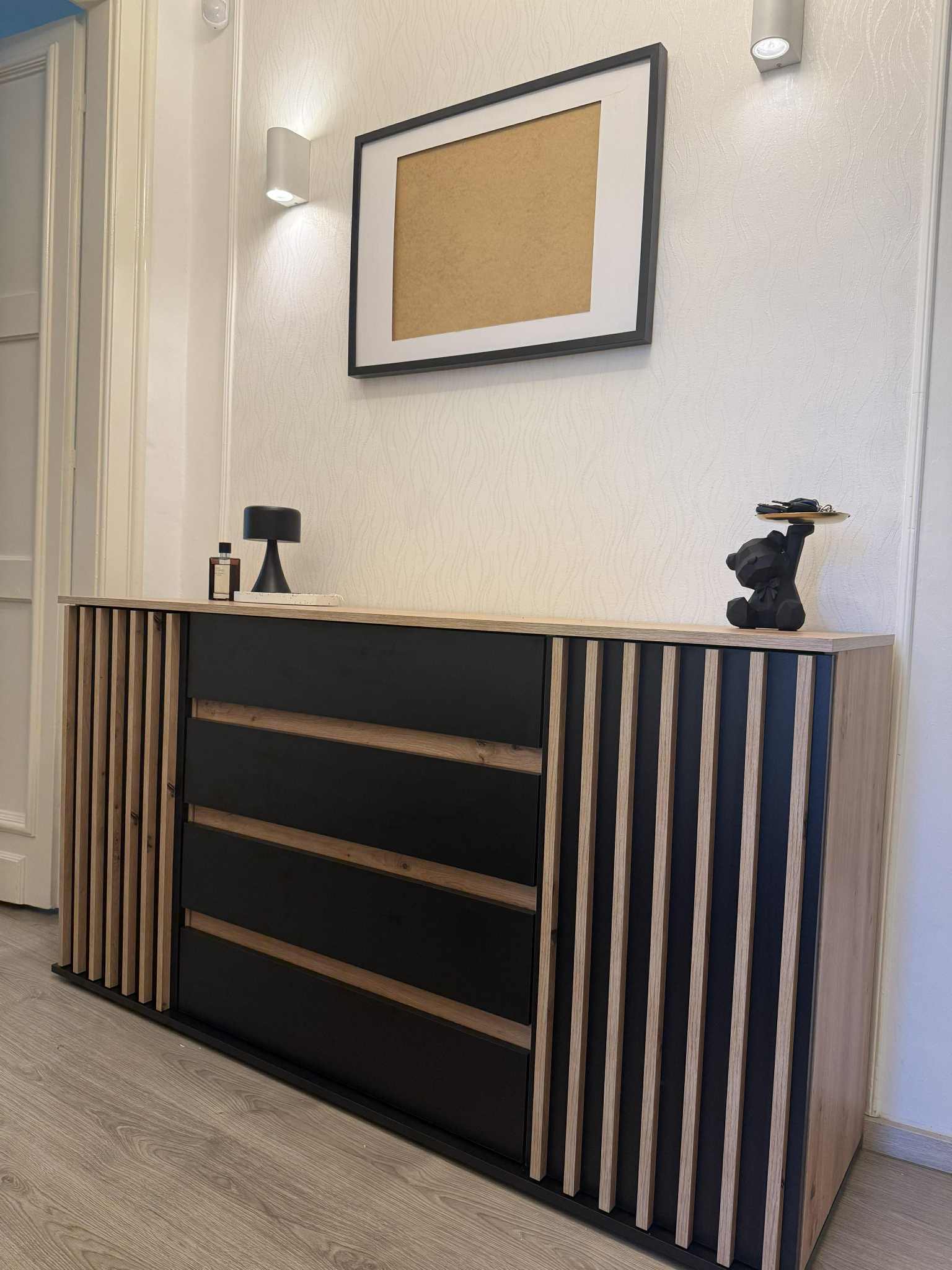 Új, modern lamellás komód dobozában, lapraszerelten.